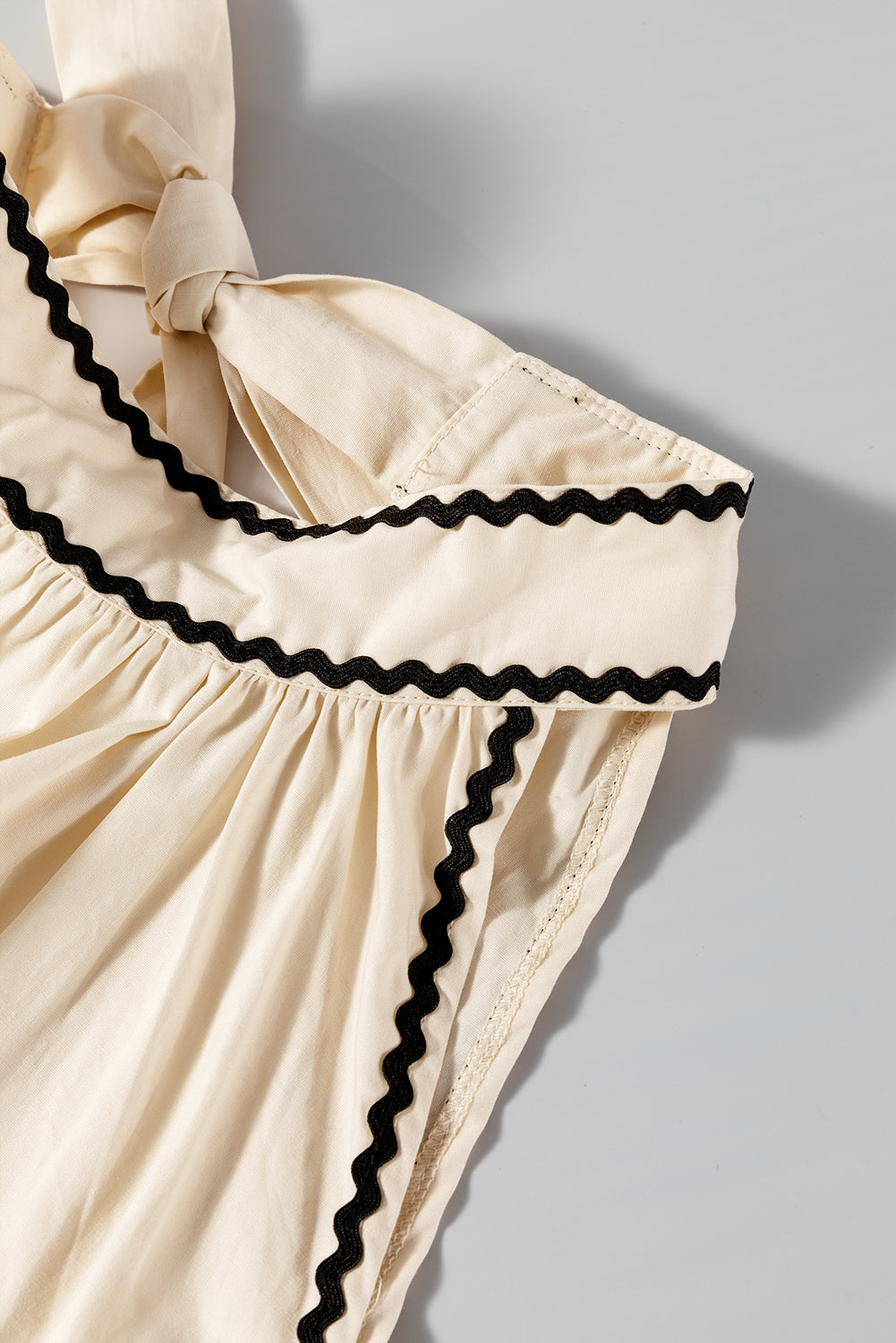 This tank top dress is the perfect choice to combine comfort and elegance. Its Ricrac garnish brings a sophisticated touch that enhances the whole, making it both exquisite and chic. The sleeveless design, associated with a graceful Licou pass, offers a feminine and modern silhouette. The Licou pass is ideal for giving off the neck while bringing an elegant dimension to the dress. The trapezoid silhouette of the dress is particularly flattering, creating a soft and fluid line that is suitable for many morphologies.