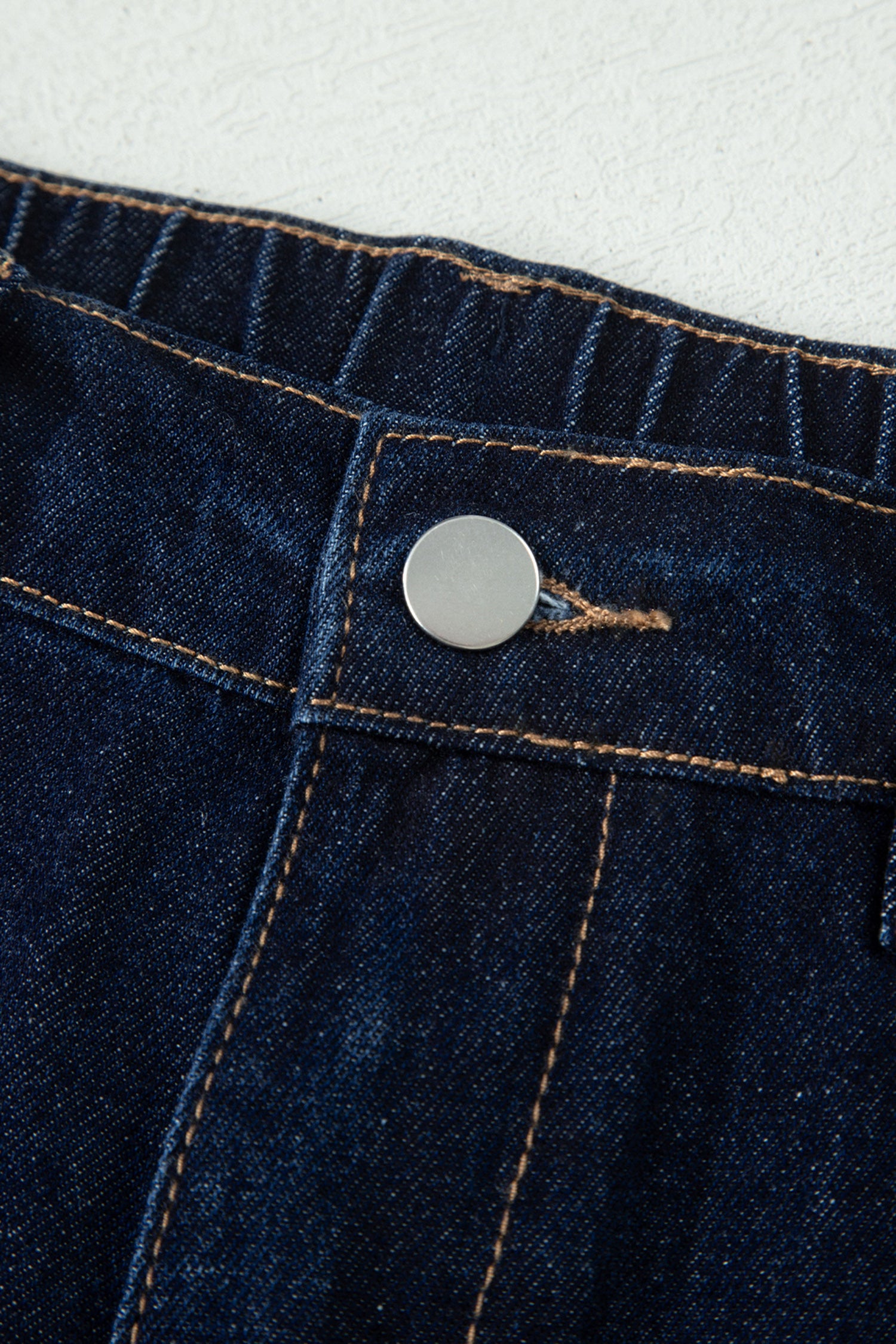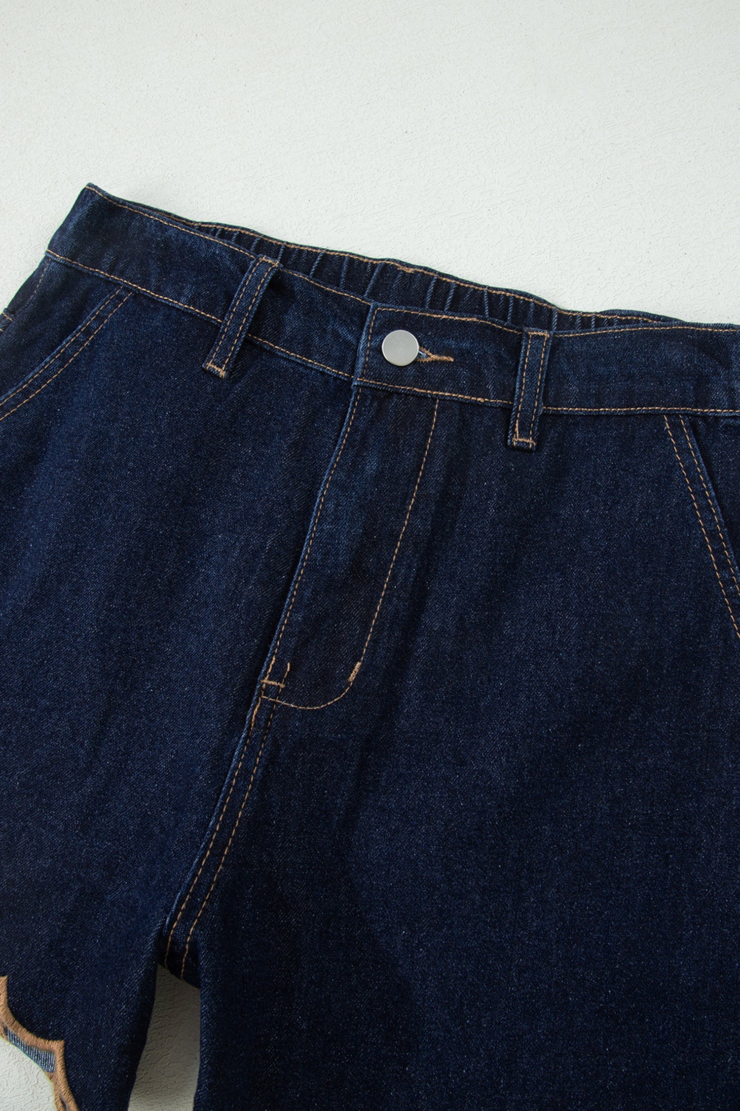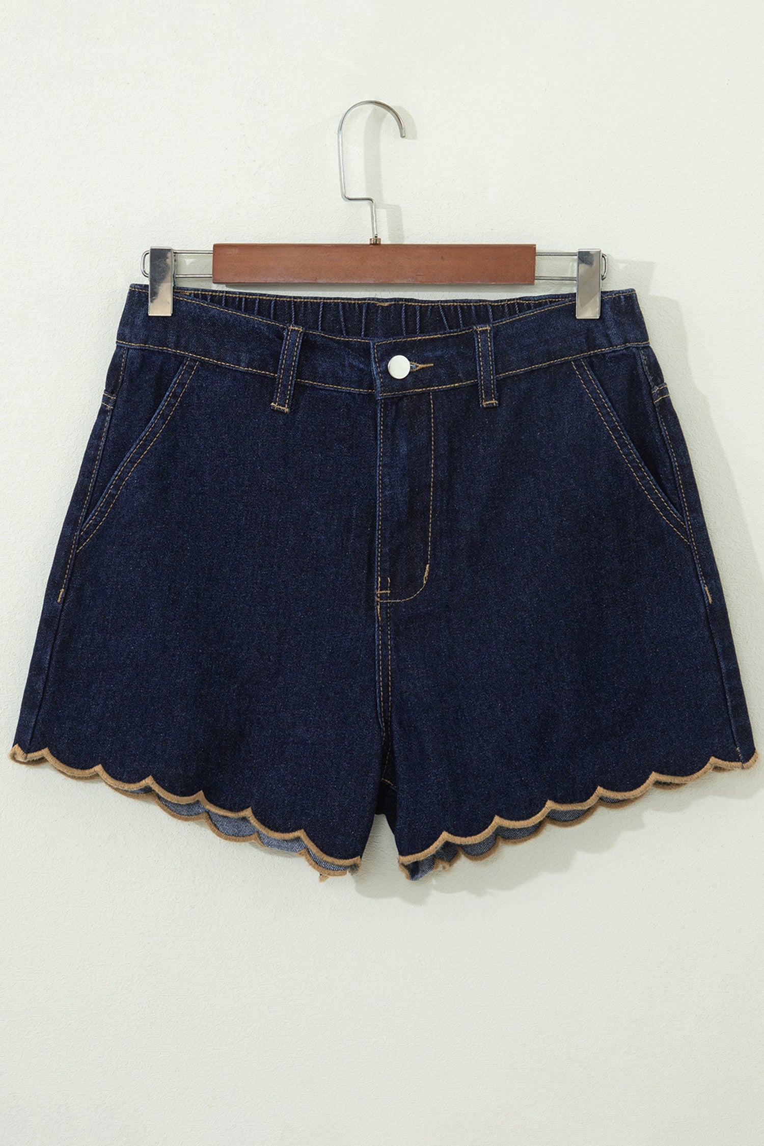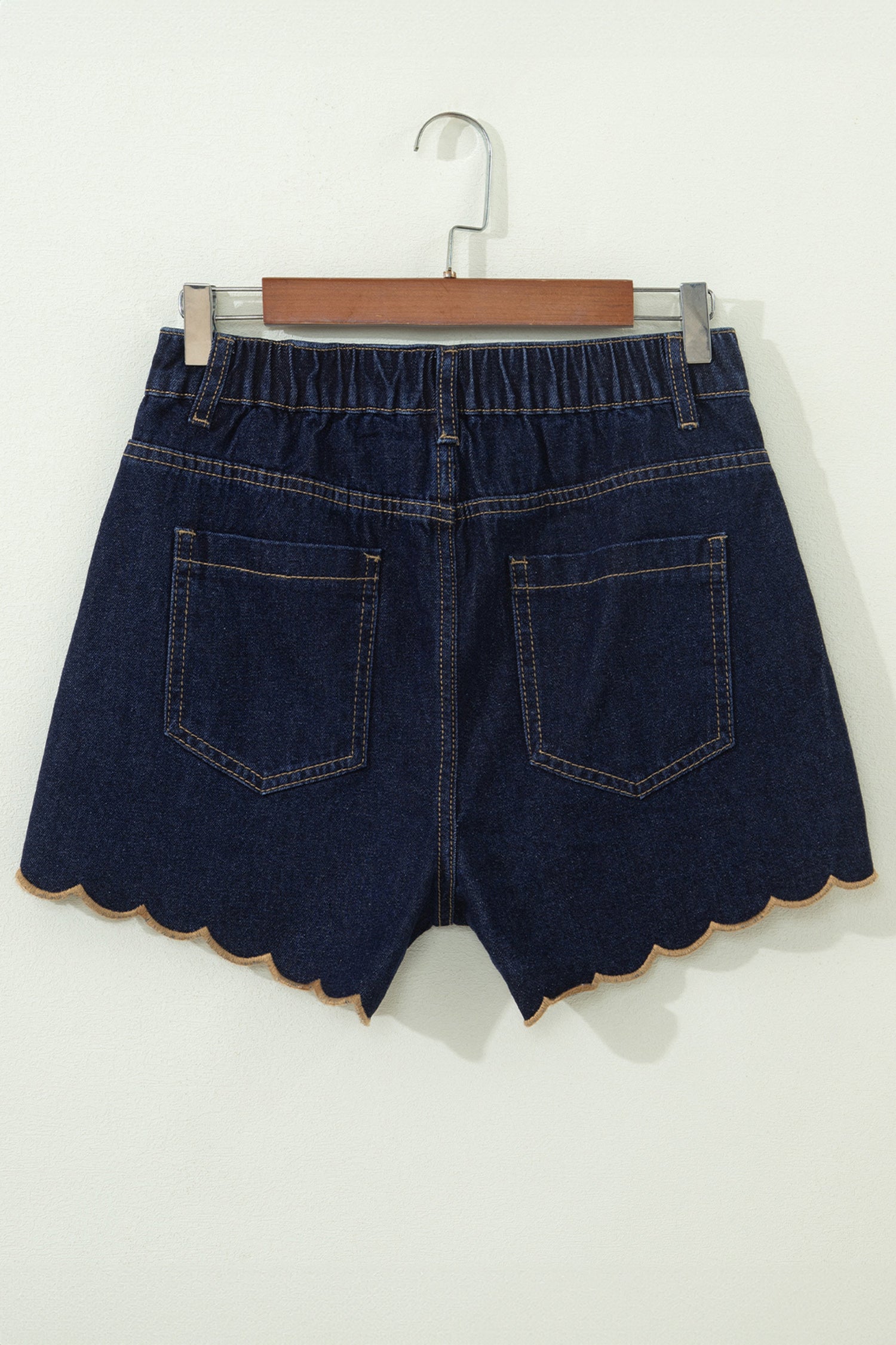 Ce short en jean apporte une touche féminine à la coupe classique. Conçu avec une taille haute flatteuse et une longueur mini. Ce short présente un ourlet festonné orné de broderies contrastées. À porter avec un top ajusté pour un look estival charmant et décontracté.