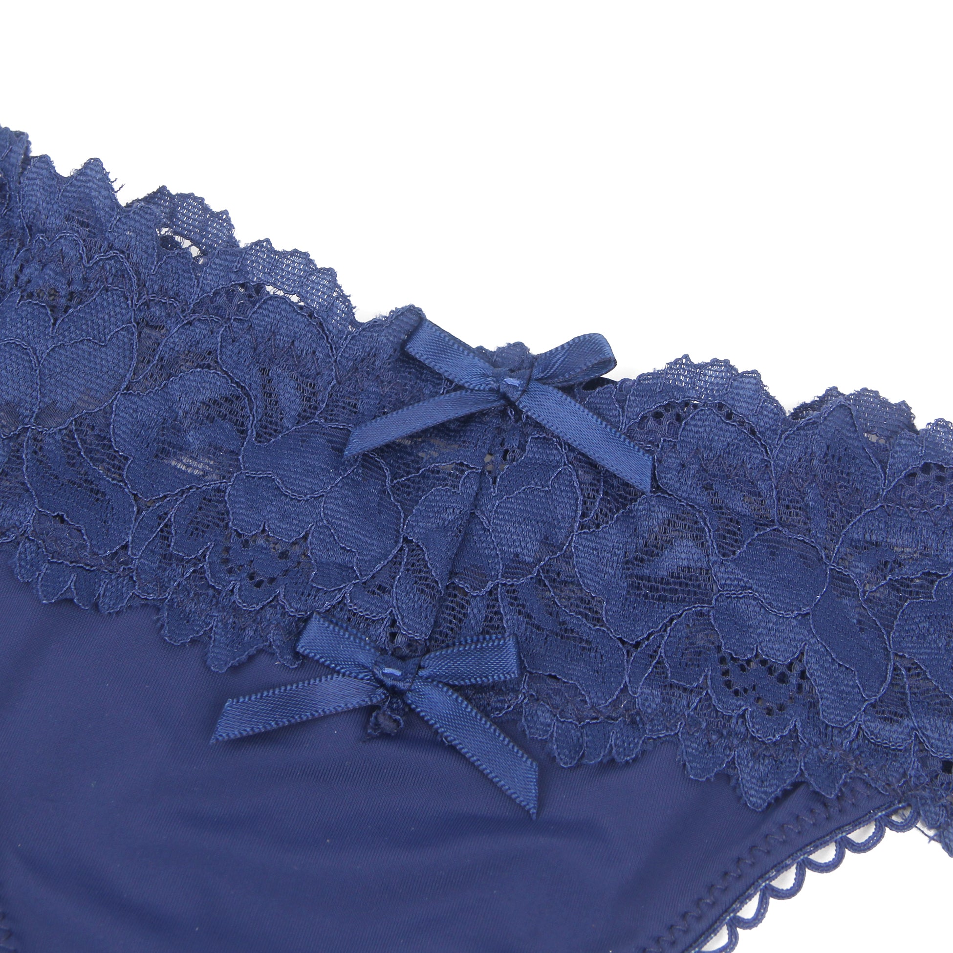 String orné d'une large bande de dentelle bleue à la taille. Laçage croisé au dos pour une touche sexy et raffinée. Gousset doublé en coton.