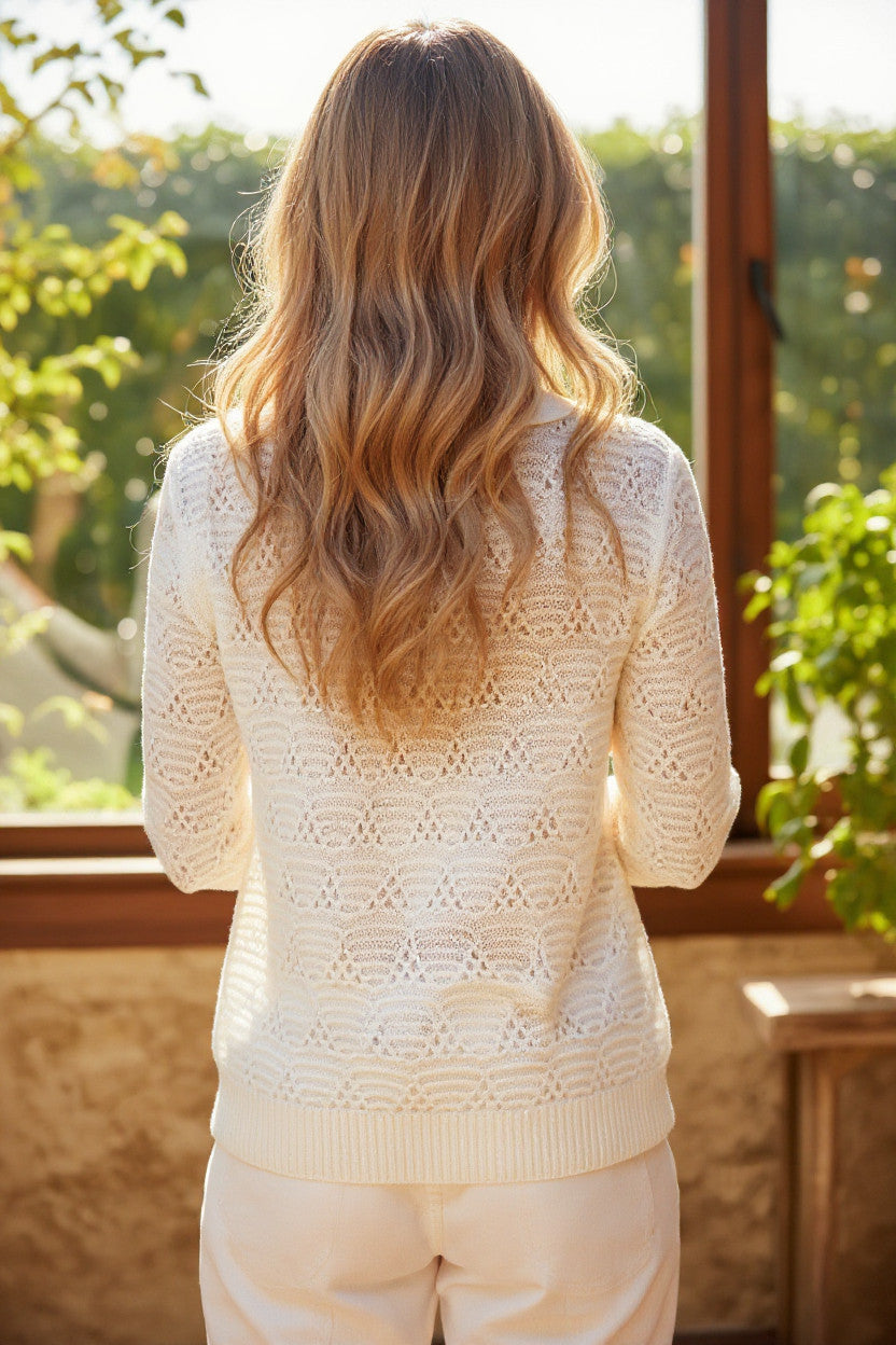 Ce gilet ajouré blanc est une pièce délicate et raffinée à avoir dans toute garde-robe féminine. Son tricot fin et ajouré dessine de jolis motifs ondulés, parfaits pour une touche de romantisme tout en légèreté. La coupe droite et les finitions côtelées lui donnent une allure moderne, facile à associer avec un jean, une jupe ou une robe fluide.