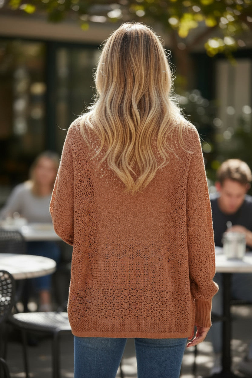 Réalisez vos rêves de mode avec ce cardigan ouvert au charme bohème, parfait pour rehausser vos tenues avec légèreté. Confectionné dans un tricot fin et doux, il est orné de motifs délicats qui lui donnent une allure chic et décontractée.