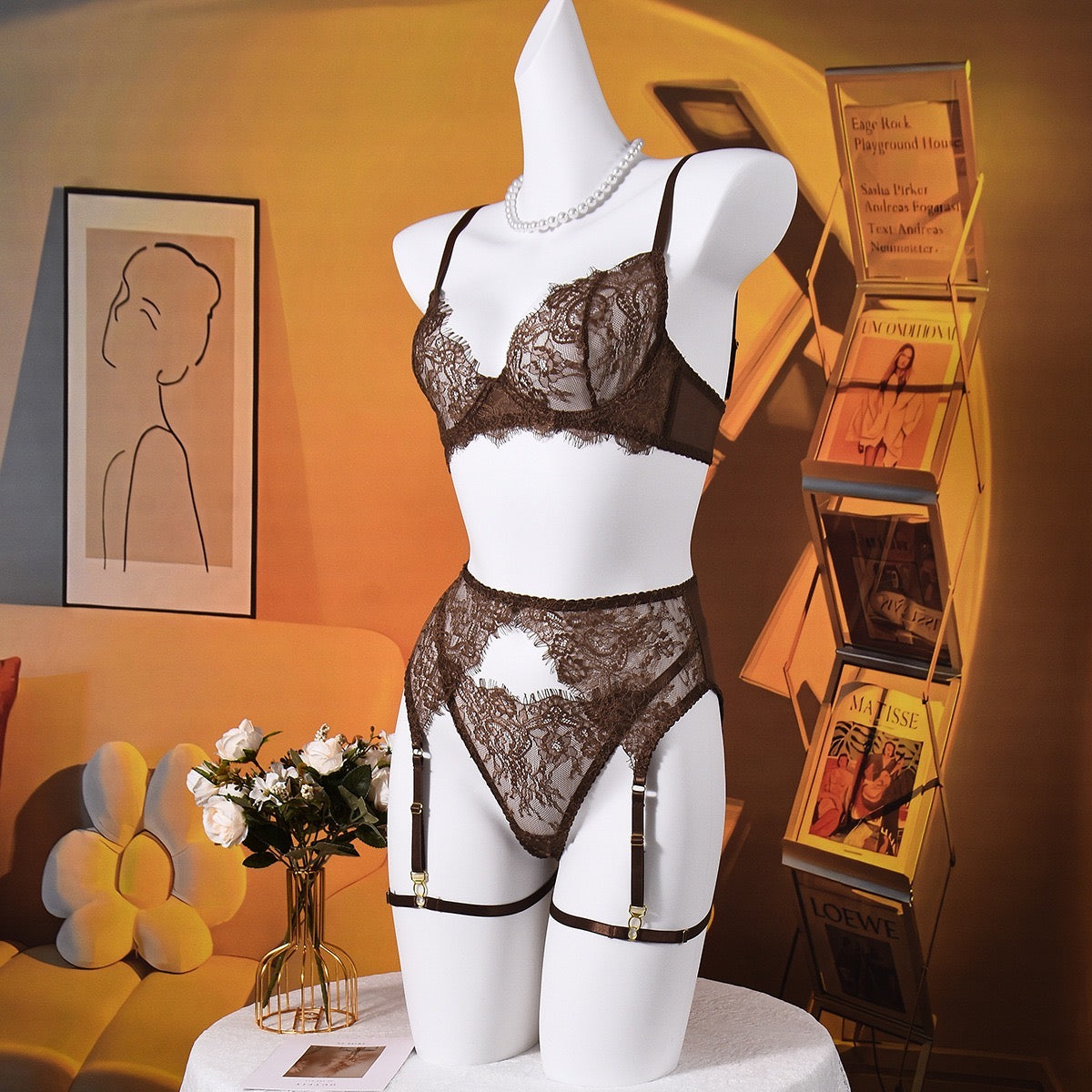 Une silhouette divine, un soutien sensuel, et un soupçon de provocation : cet ensemble 3 pièces en dentelle noire est une ode à l’élégance nocturne. Son bustier galbant, son porte-jarretelles sophistiqué et son string délicat composent un trio irrésistible. Le raffinement de la dentelle florale se mêle à des lignes sensuelles, pour sublimer vos courbes avec assurance et glamour.