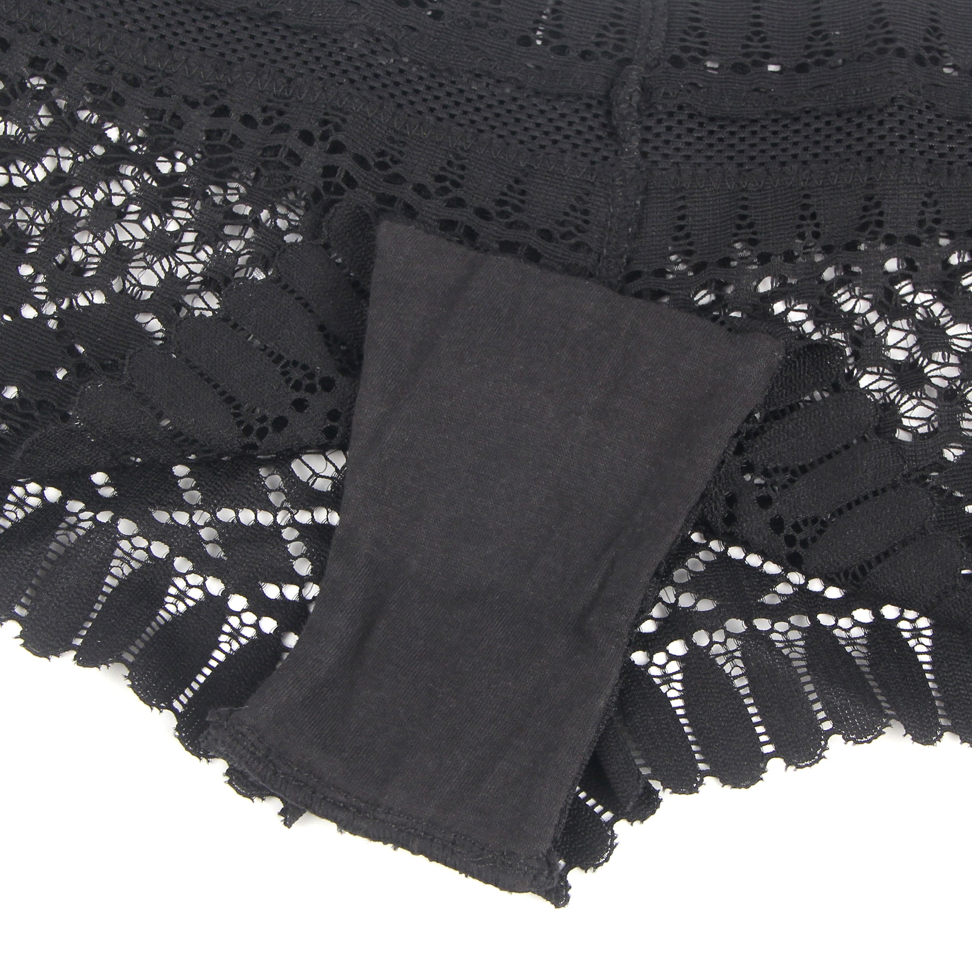 Shorty taille haute en maille ajourée noire ultra extensible, au motif graphique. Coupe galbante et bordures festonnées pour un effet seconde peau. Gousset doublé en coton.