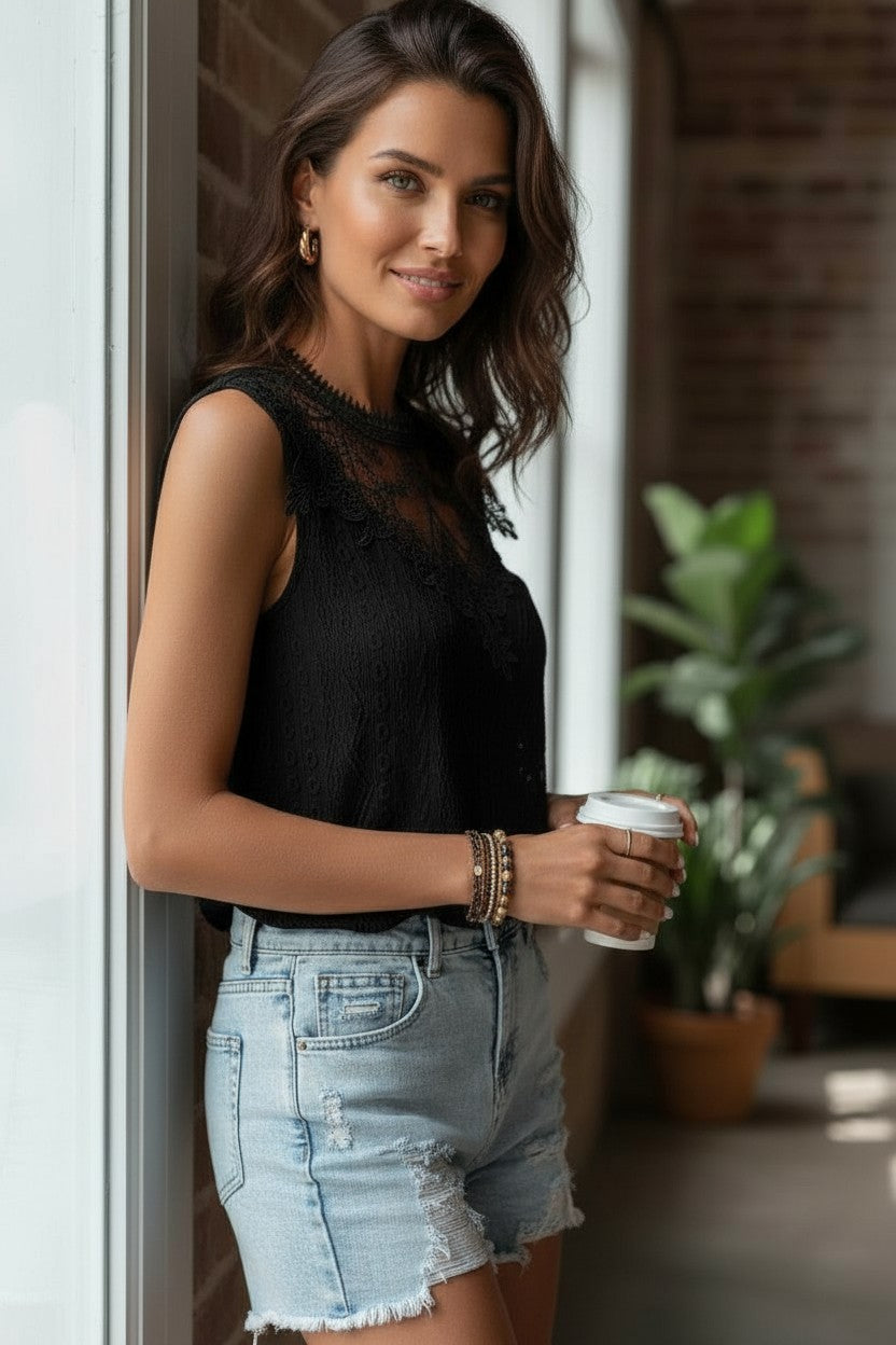 Esta sólida camiseta sin mangas encarna un estilo sin esfuerzo al tiempo que garantiza un aspecto atemporal y clásico. Su diseño de encaje de crochet trae un toque de delicado refinamiento, ideal para ocasiones relajadas y vestidas. La parte posterior de la camiseta sin mangas está decorada con un diseño elegante en el orificio de bloqueo, creando una silueta moderna mientras agrega un toque de encanto y sensualidad. Este modelo se distingue por un sutil efecto hueco, que trae una dimensión visualmente atractiva que resalta el corte. Diseñado para adaptarse a una silueta femenina, también se usa durante una excursión relajada como para eventos más formales, al tiempo que ofrece una comodidad óptima gracias a su tela ligera y agradable.