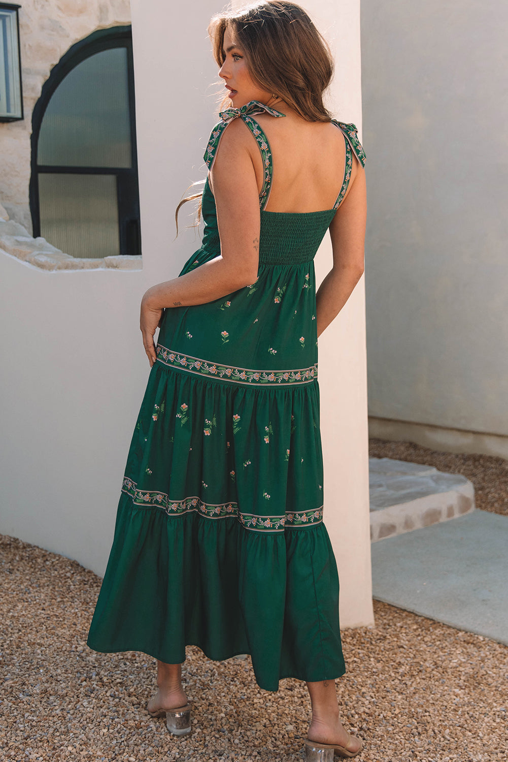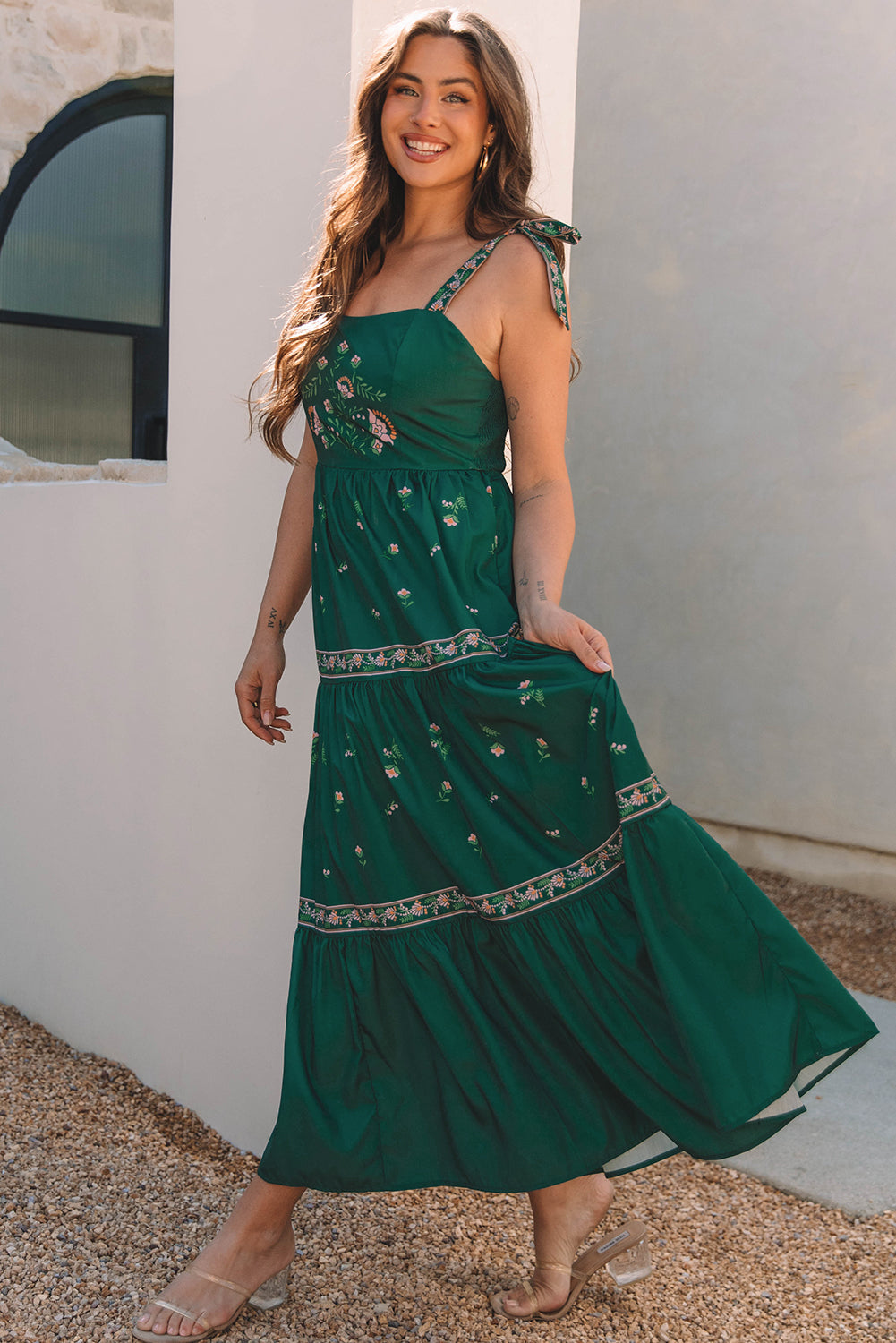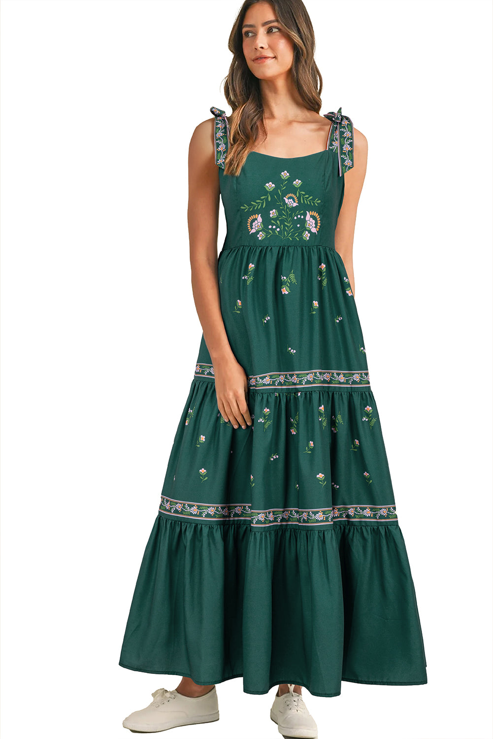 Este vestido largo con el estampado floral bohemio es perfecto para un aspecto elegante y femenino. Con su diseño de fluido y detalles ordenados, le traerá comodidad y estilo en cualquier ocasión. El vestido se distingue por varias características: