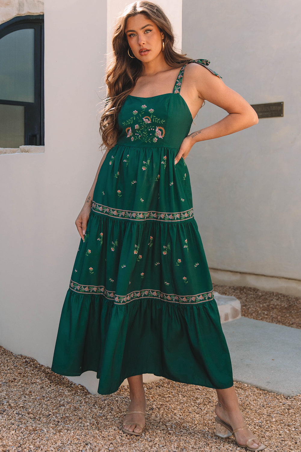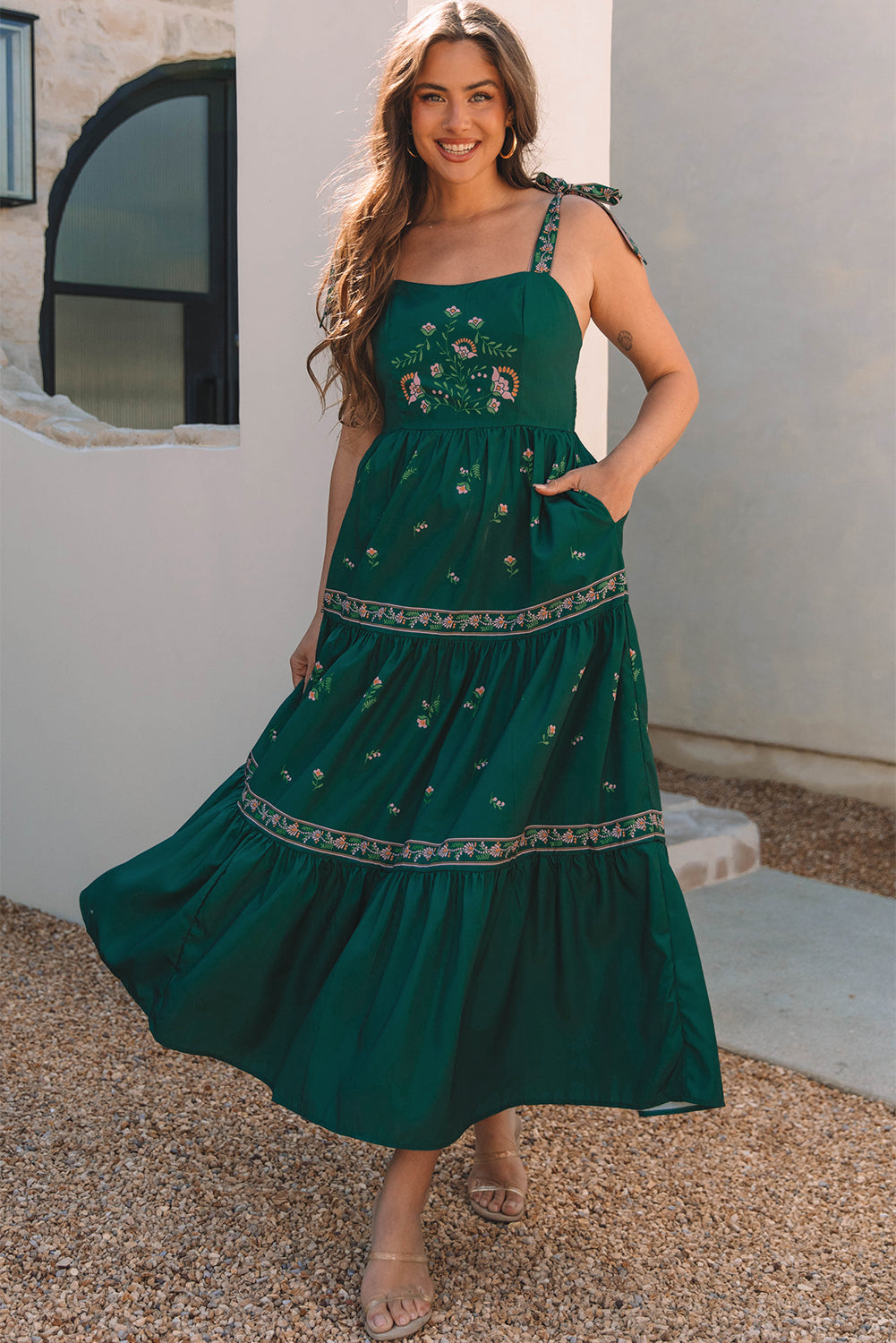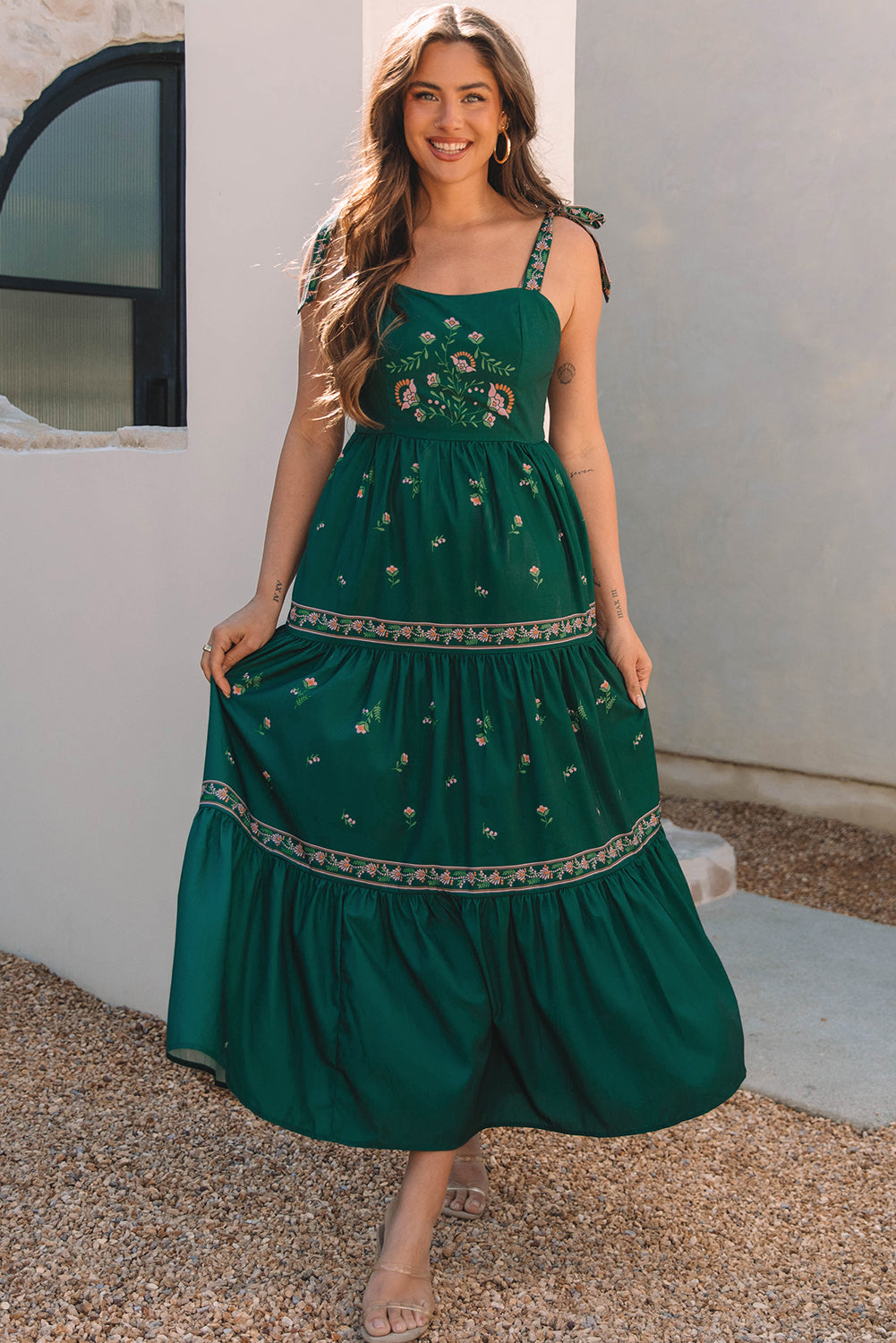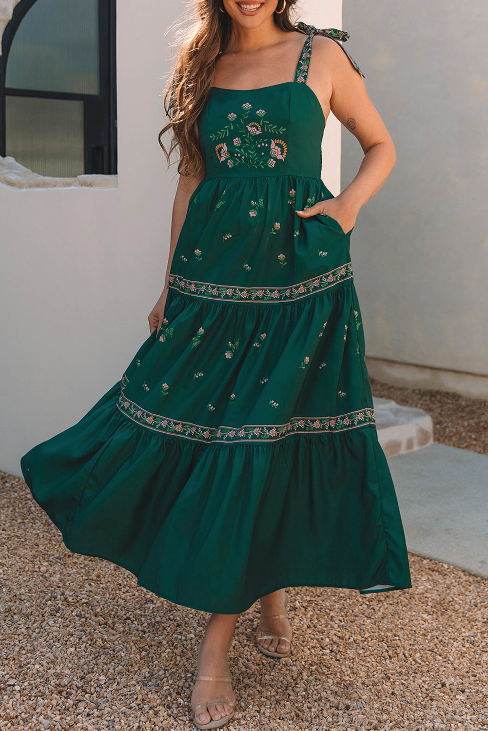 Este vestido largo con el estampado floral bohemio es perfecto para un aspecto elegante y femenino. Con su diseño de fluido y detalles ordenados, le traerá comodidad y estilo en cualquier ocasión. El vestido se distingue por varias características: