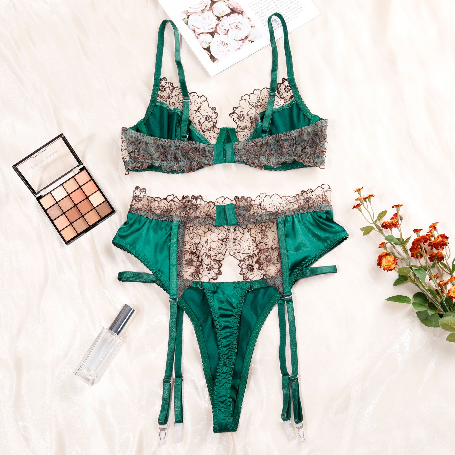 Sublimez vos courbes avec cet ensemble vert émeraude d’une élégance rare. Mélange de broderie florale délicate et de satin luxueux, cette lingerie sophistiquée séduit par ses finitions raffinées et son allure impériale. Un bijou de sensualité à porter pour séduire avec style.