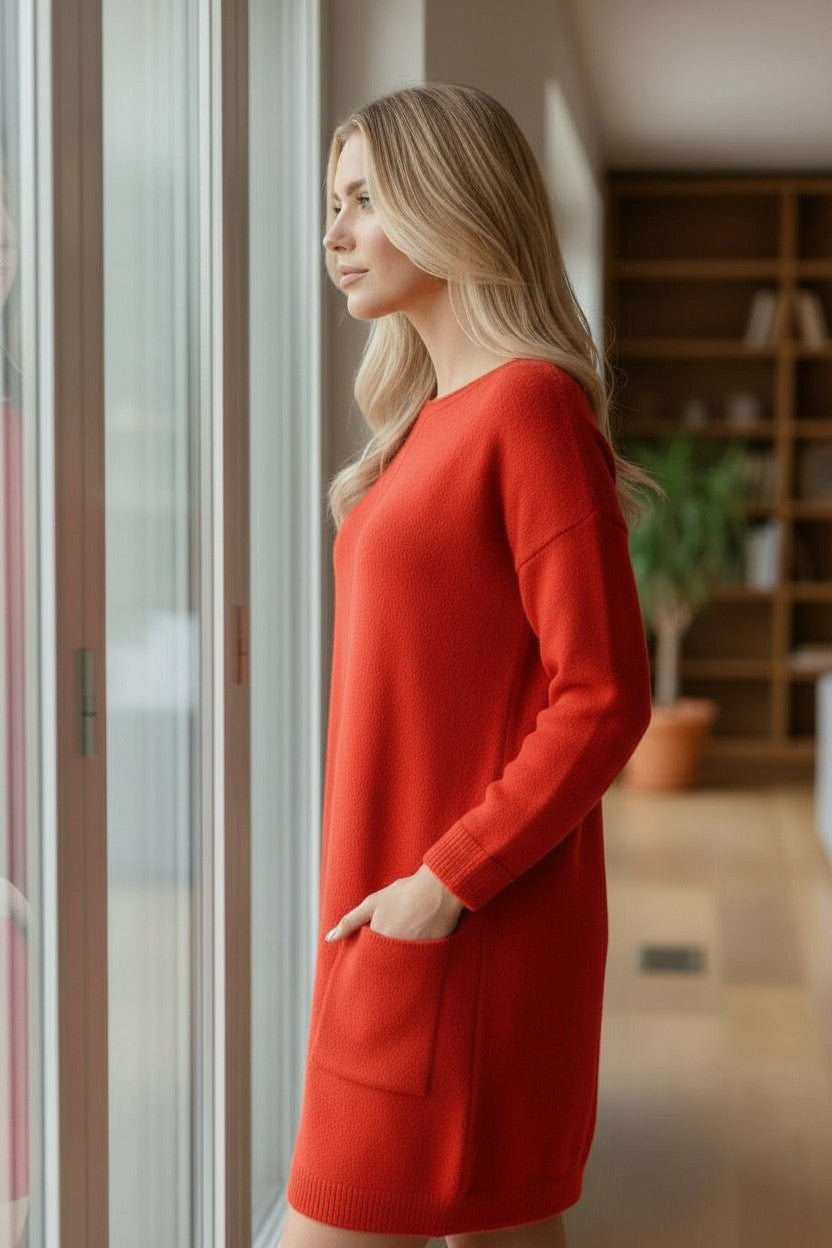 Enveloppez-vous dans la chaleur douce et le chic minimaliste de cette robe pull oversize, confectionnée dans une maille italienne généreuse. Avec ses poches plaquées et sa coupe fluide, elle incarne le confort absolu sans jamais sacrifier l’élégance. Parfaite pour les journées cocooning comme pour vos sorties en ville.