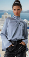 Offrez-vous un style sophistiqué avec ce chemisier élégant pour femme, conçu pour une allure à la fois moderne et intemporelle. Le col roulé asymétrique plissé apporte une touche contemporaine, alliant confort et style. La plissé ajoute de la texture et du mouvement au col, tout en soulignant la silhouette avec subtilité. Sa coupe est pensée pour flatter toutes les morphologies.