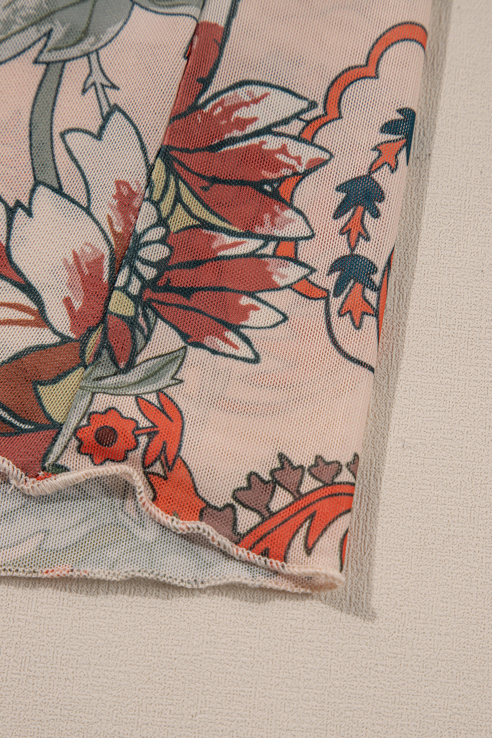 Chemisier orange à imprimé floral et col en V profond avec nœud et manches cloche.