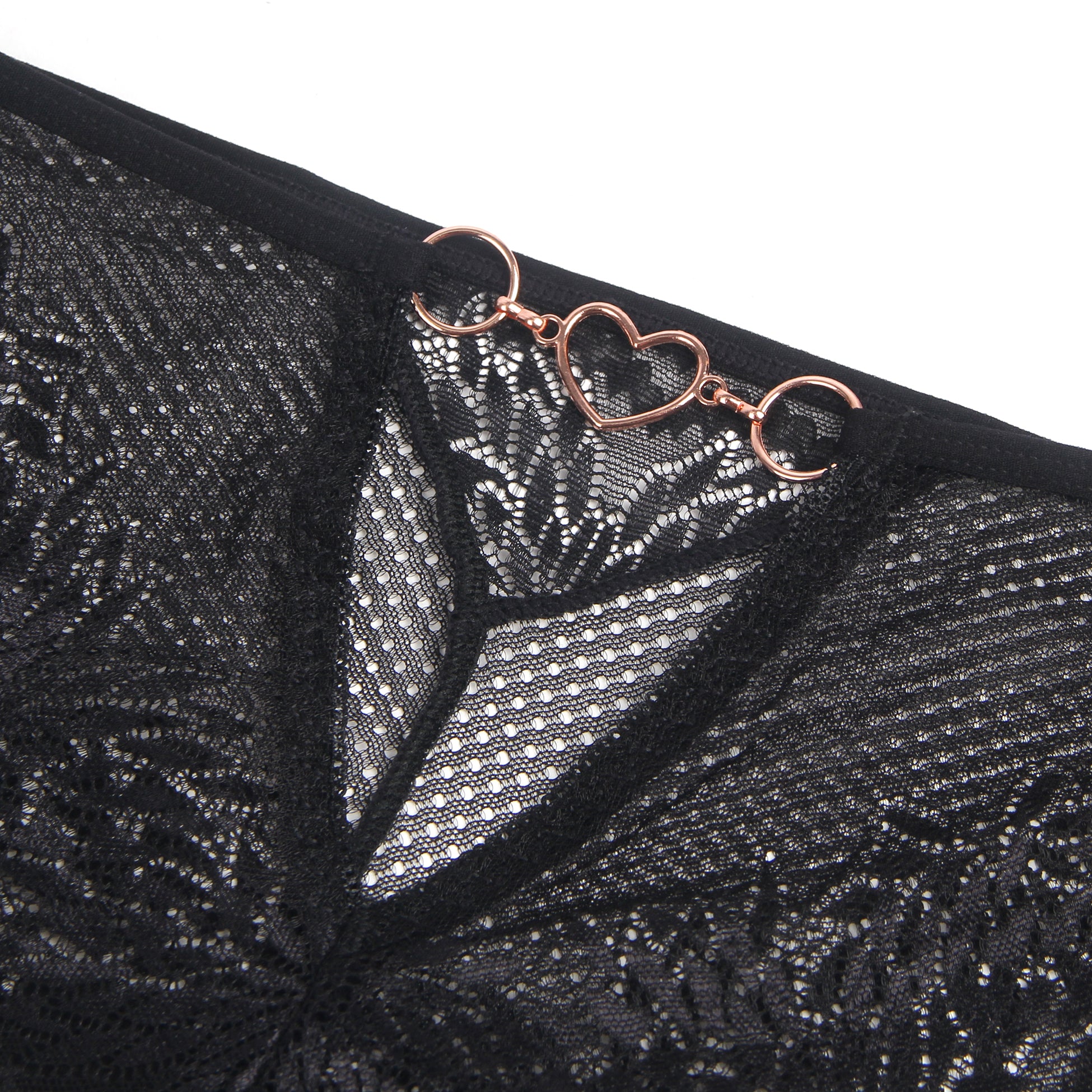 Culotte en dentelle transparente noire, avec ouverture sexy au dos soulignée par deux anneaux dorés en forme de cœur. Finition en tulle stretch et bordures festonnées. Gousset doublé en coton.