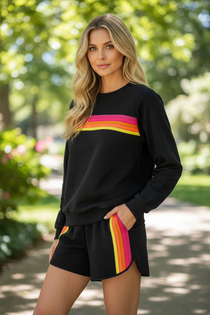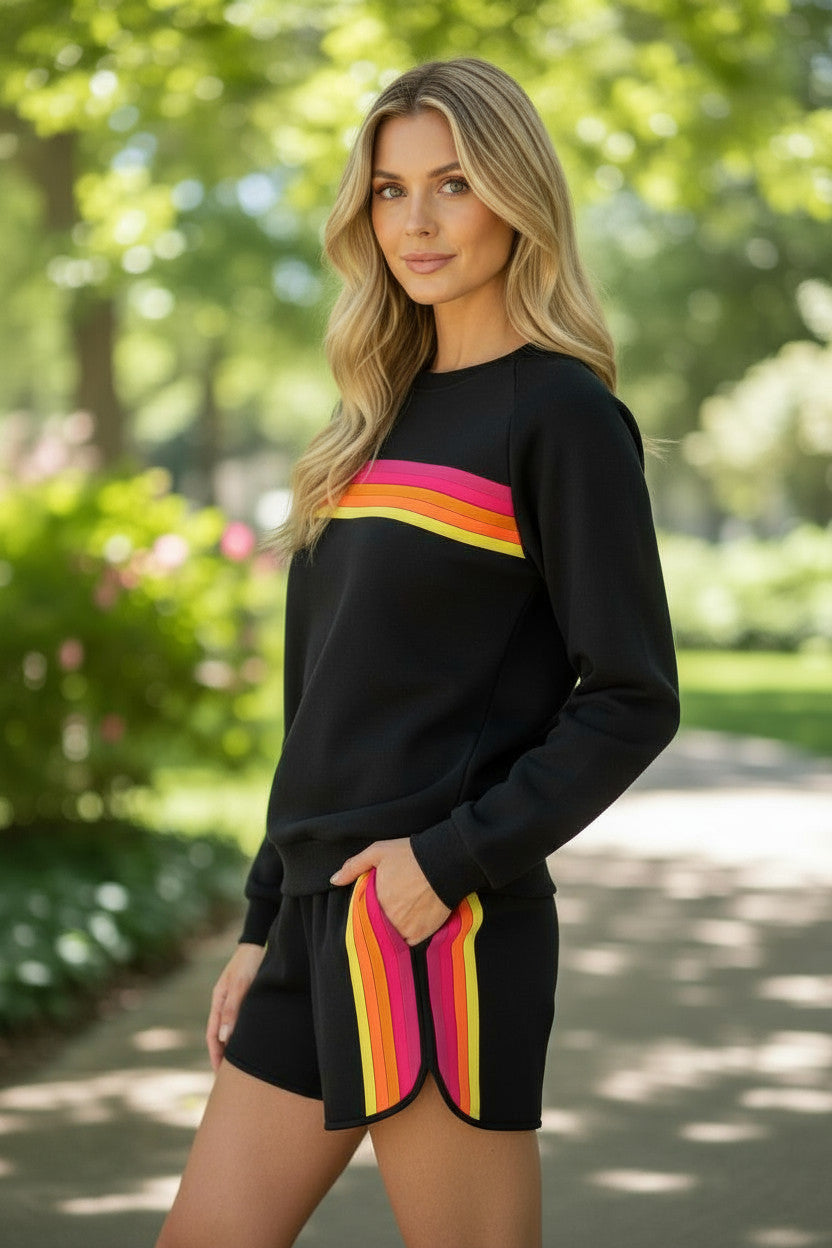 Cet ensemble décontracté combine confort et tendance avec une touche de modernité grâce à ses rayures élégantes qui apportent du contraste et du caractère.