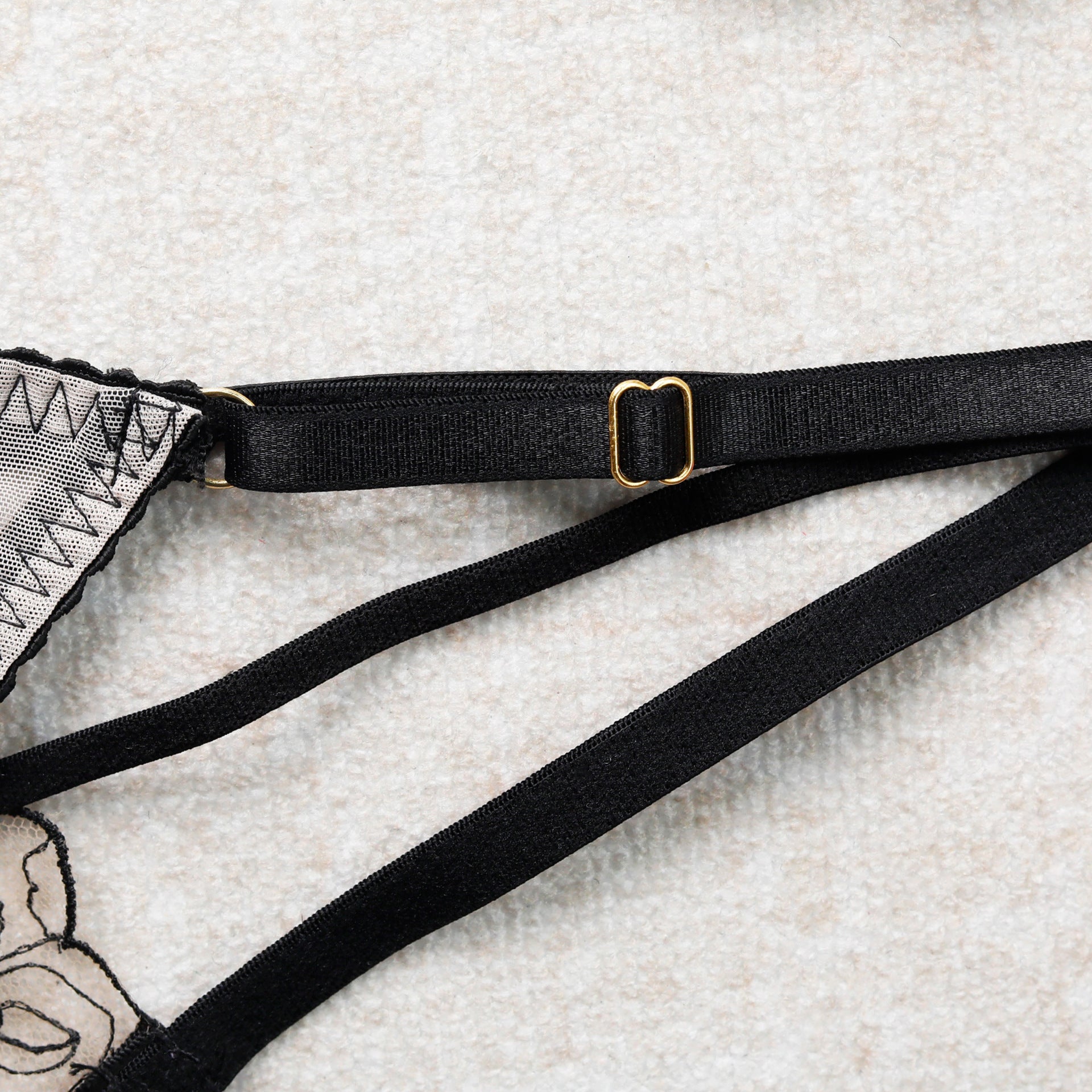 L'ensemble « Secret Bloom » incarne l’art subtil de la séduction. Le contraste entre le tulle nude et la broderie noire florale crée une illusion captivante sur la peau. Le soutien-gorge à armatures galbe naturellement la poitrine tandis que le string ultra fin élance la silhouette avec sensualité. Un ensemble à la fois raffiné, sensuel et résolument féminin 🌹