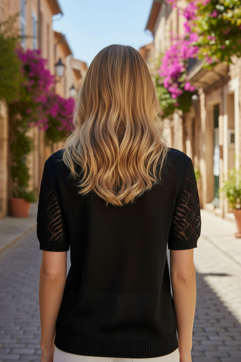 Élégance intemporelle et féminité discrète pour ce gilet ajouré noir Max & Lai. Sa maille fine et travaillée laisse deviner subtilement la peau ou un top léger en dessous, pour un effet à la fois chic et séduisant. On aime son attache bijou à l’avant, délicatement ornée, qui souligne la silhouette sans la contraindre.