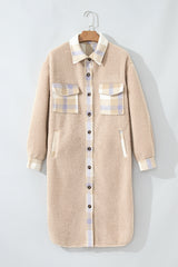 Ce manteau long en sherpa allie douceur, chaleur et design contemporain avec son élégant patchwork à carreaux.