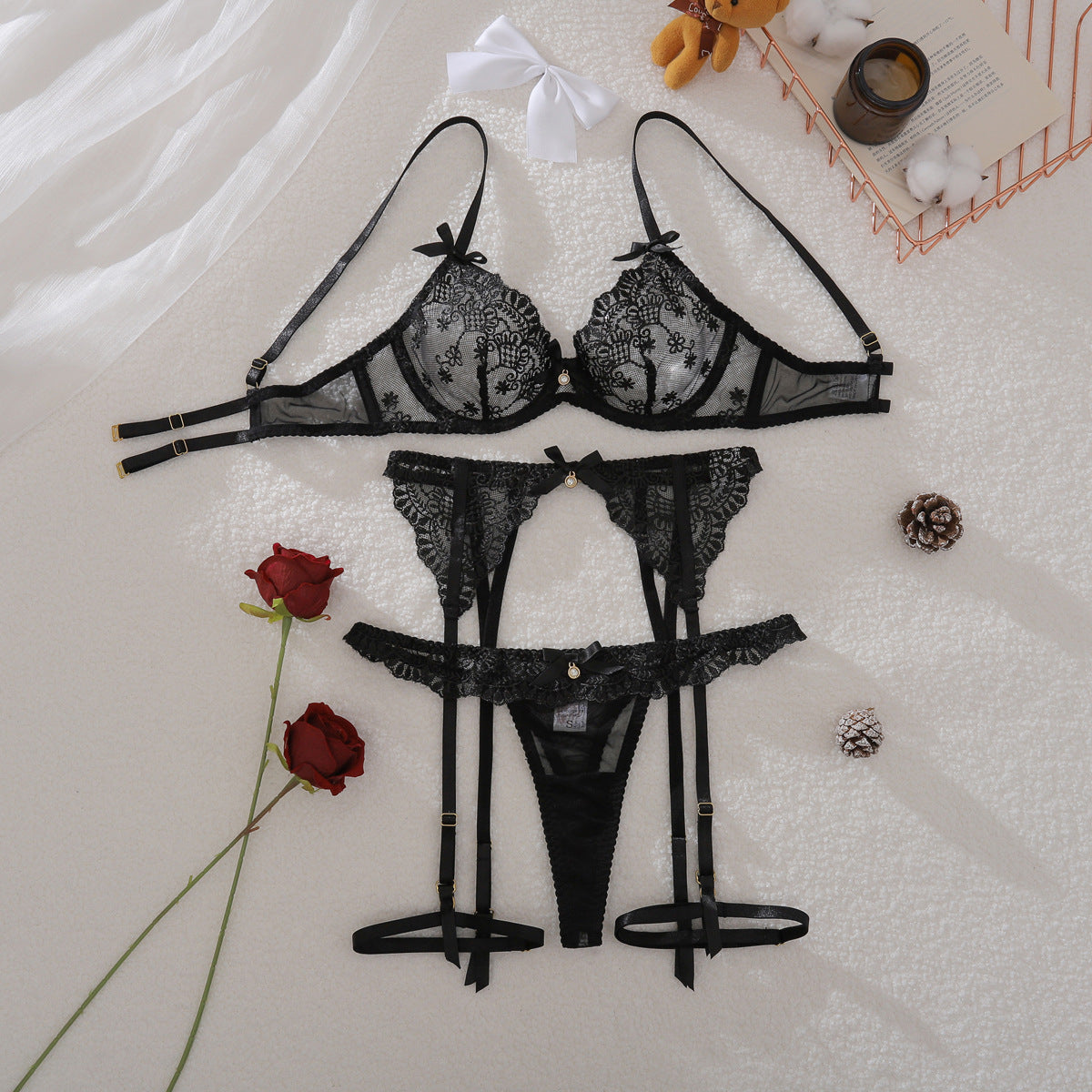 Laissez-vous envoûter par cet ensemble noir aux finitions raffinées qui évoque la passion d'une nuit à Rome. Transparence suggestive, broderie délicate, coupes sculptantes : chaque détail est pensé pour sublimer vos courbes avec audace et élégance.