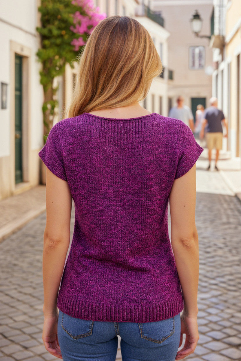Ce top tricoté fuchsia séduit par sa maille douce et sa coupe féminine. Léger et confortable, il présente un joli col en V et des manches courtes pour une allure à la fois décontractée et élégante. Parfait pour les beaux jours, il s’associe facilement à un jean ou une jupe pour un look casual chic.